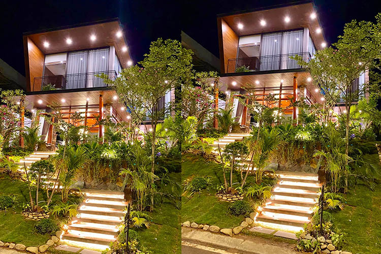 Thiết kế biệt thự nghỉ dưỡng điển hình với cầu thang giữa cho những mẫu nhà hiện đại đầy thú vị, gam nàu nâu của gỗ, màu tối kết hợp giúp không gian thêm thú vị hơn, lan can được thiết kế bằng kính.